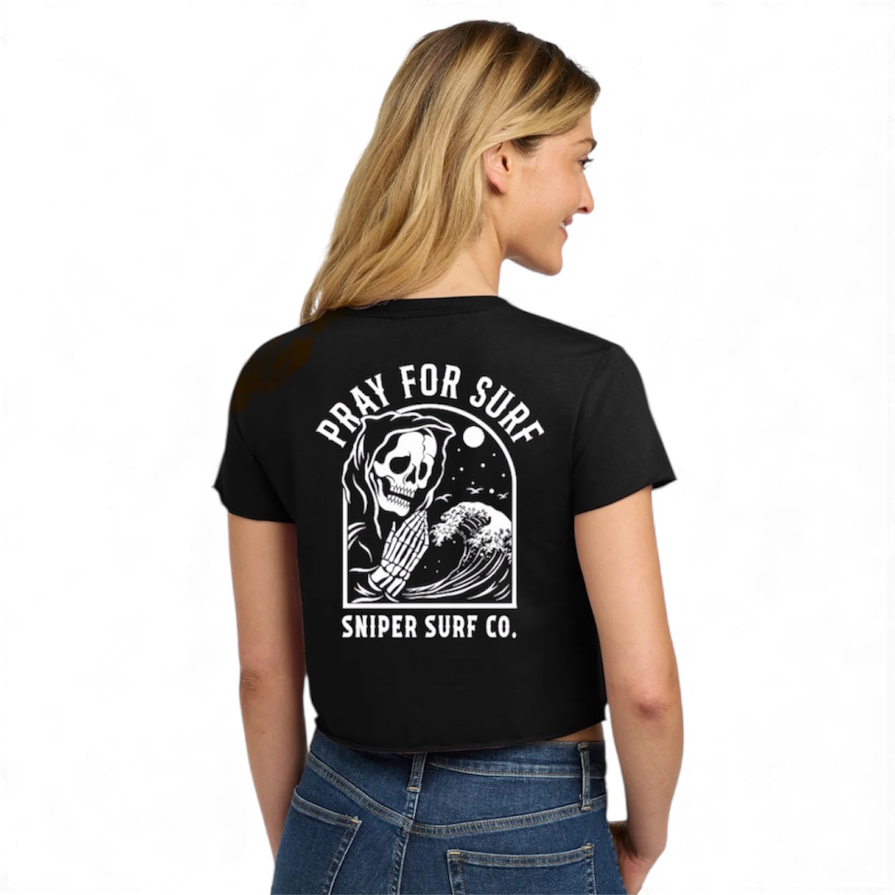Pray for Surf Women's Crop Top Short Sleeve (Reaper Black)